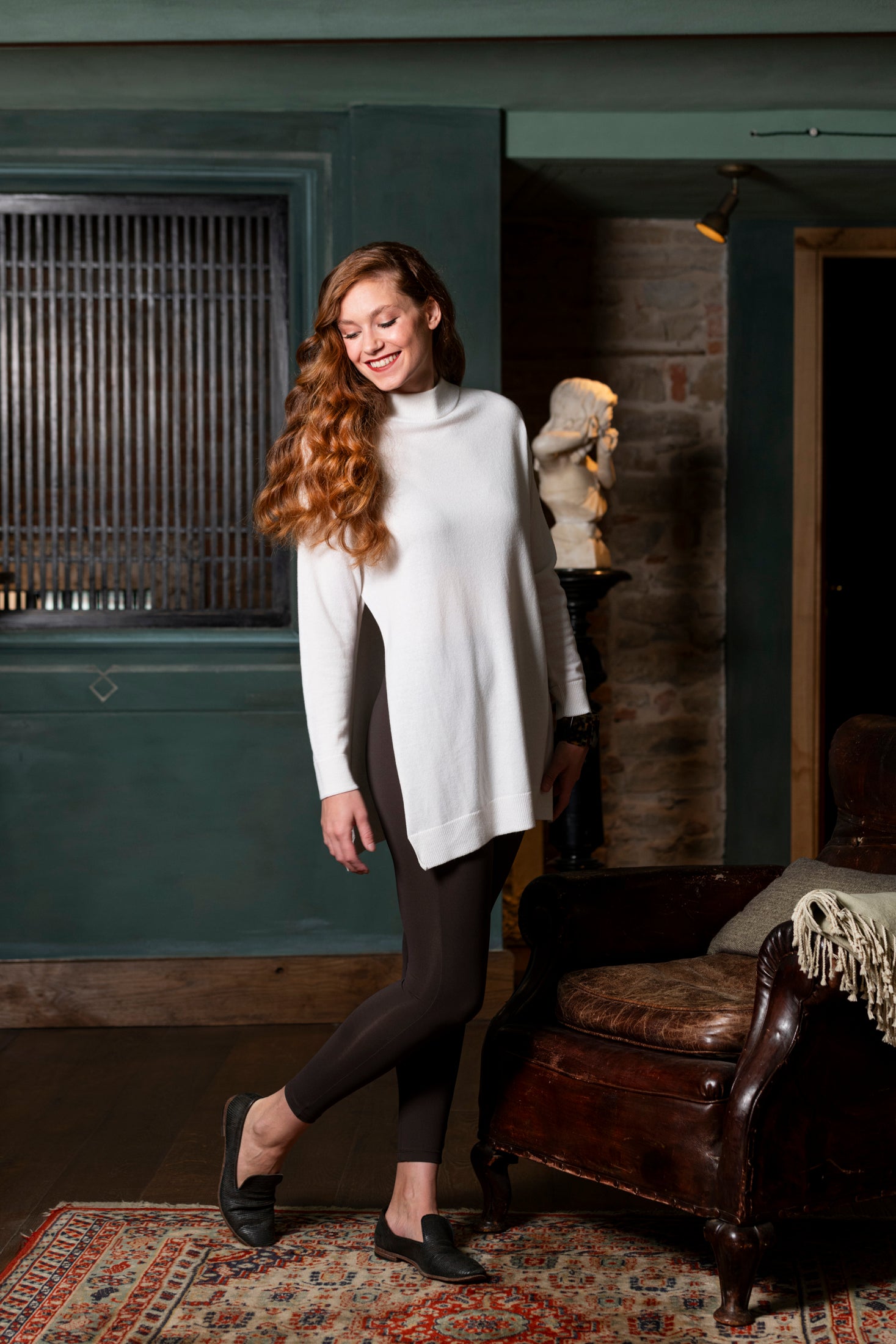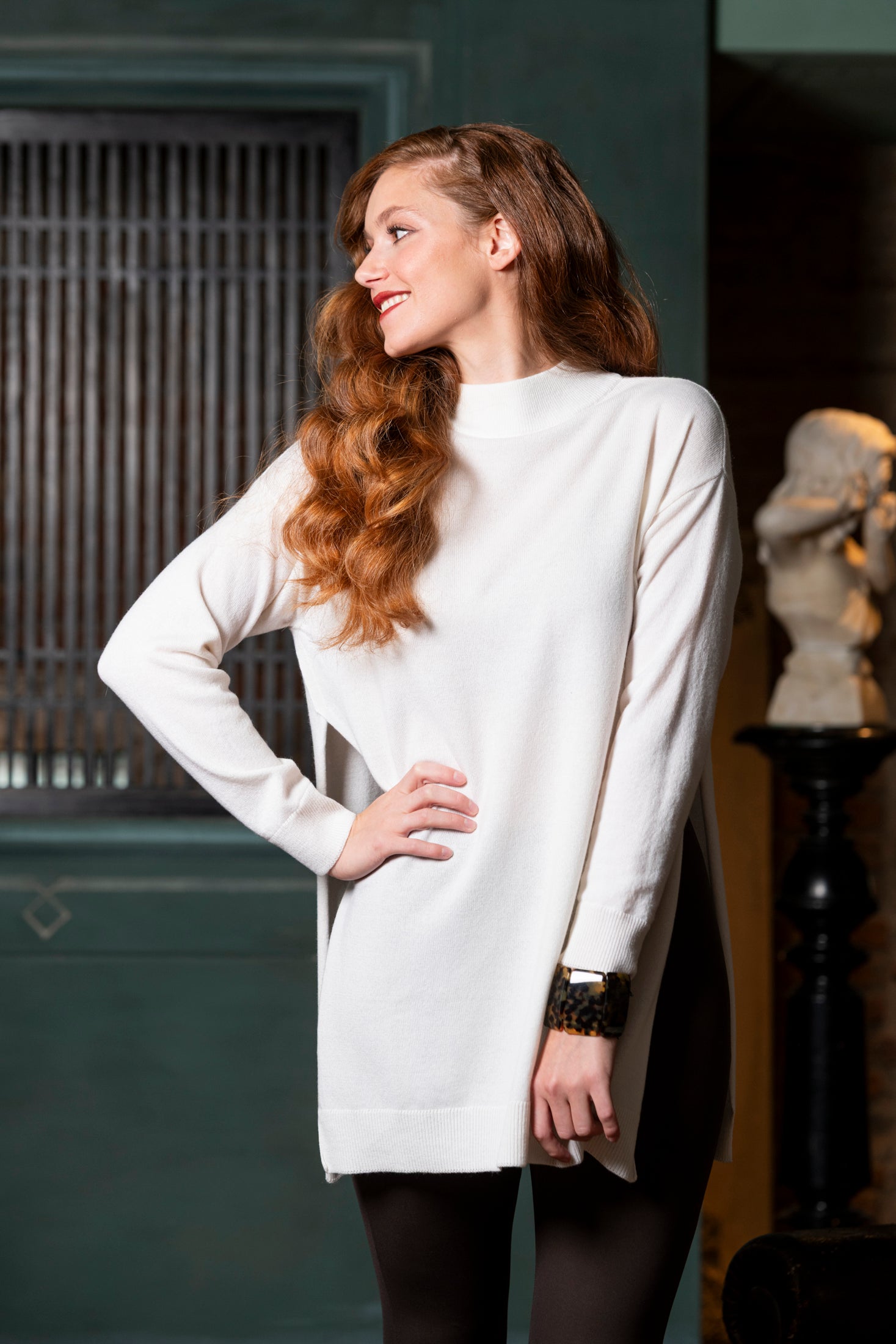 Lupetto lungo con ampia apertura laterale. Perfetto con pantaloni dalla linea più asciutta tipo leggings o fuseaux. Molto bello anche indossato con una cintura. La vestibilità regolare e la spalla è scesa.